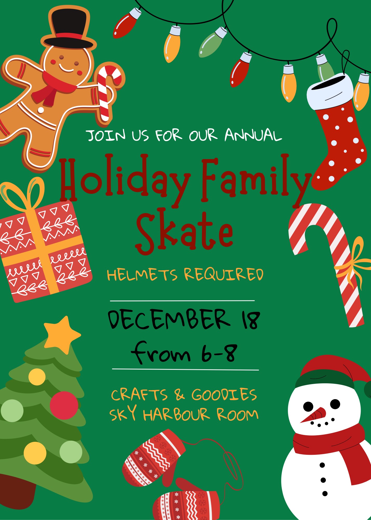 We will be hosting our Association’s Christmas gathering on Thursday, December 18th. The ice will be open to everyone for a family skate from 6-8 pm. Please remember to wear your helmets. We’ve also booked the Sky Harbour Room from 6-8 pm for visiting, crafts, and treats.